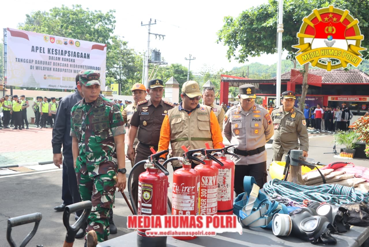 Apel dipimpin langsung oleh Kapolres Wonogiri AKBP Wahyu Sulistyo, S.H., S.I.K., M.P.M., dan dihadiri jajaran Forkopimda Wonogiri mulai dari Dandim 0728/Wonogiri Letkol Inf Edi Ristriyono, Wakil Bupati Imron Rizkyarno, hingga Kepala BPBD Fuad Wahyu Pratama.