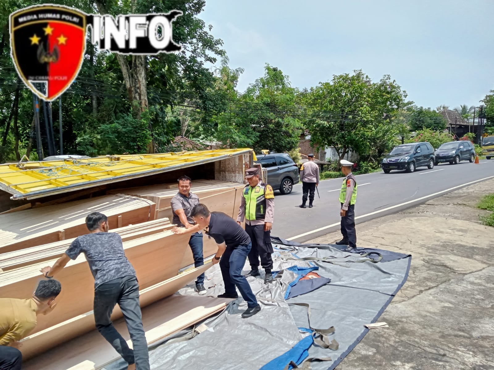Terlihat Kaporles Wonogiri AKBP Jarot Sungkowo, S.H., S.I.K., turun dari mobil dinasnya dan langsung membantu mengangkat muatan truk berupa triplek yang berserakan dijalan.
