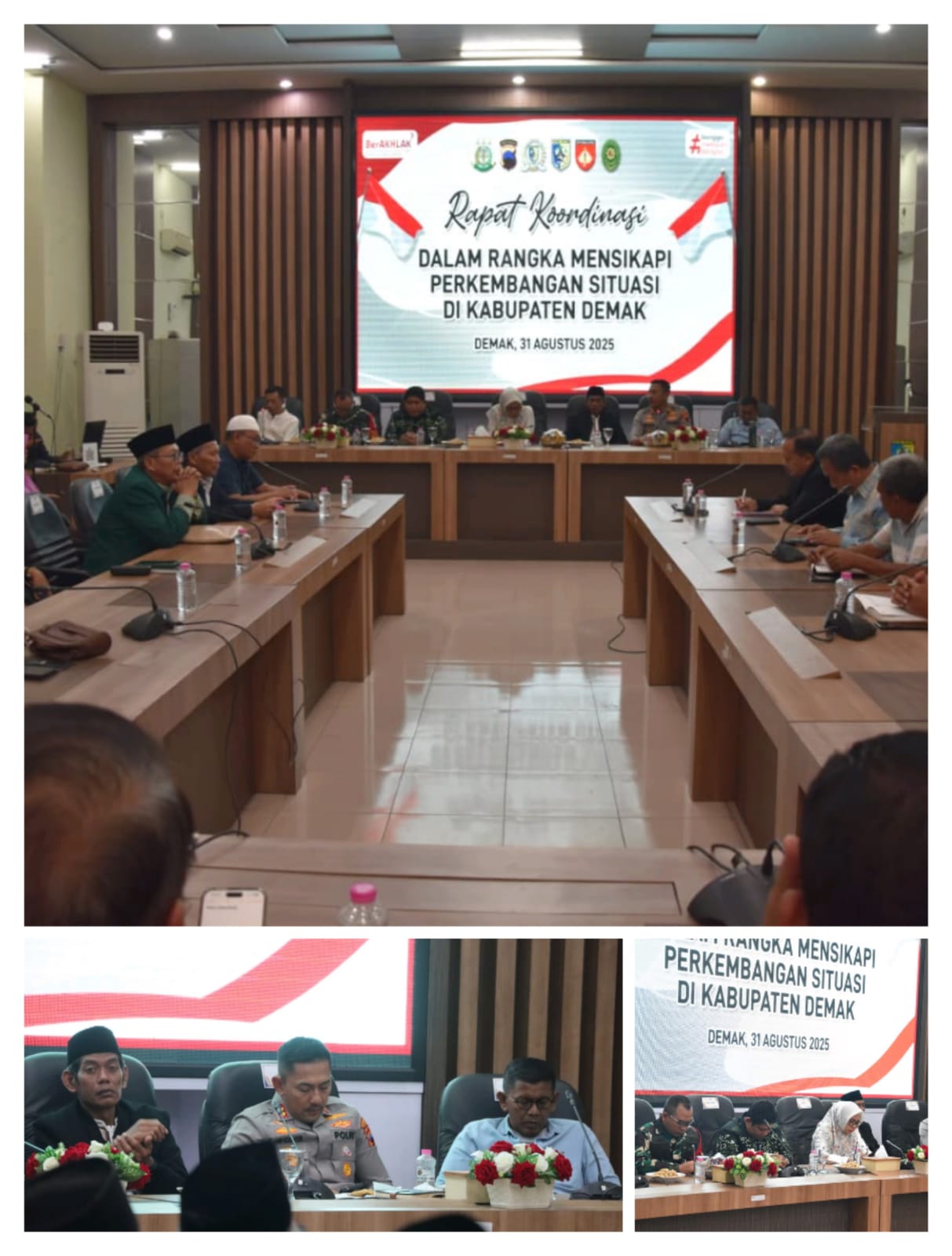 Forum Komunikasi Pimpinan Daerah (Forkopimda) Kabupaten Demak menggelar rapat koordinasi (Rakor) bersama tokoh masyarakat, tokoh agama, dan organisasi kemasyarakatan di Gedung Bina Praja, Minggu (31/8/2025) malam.