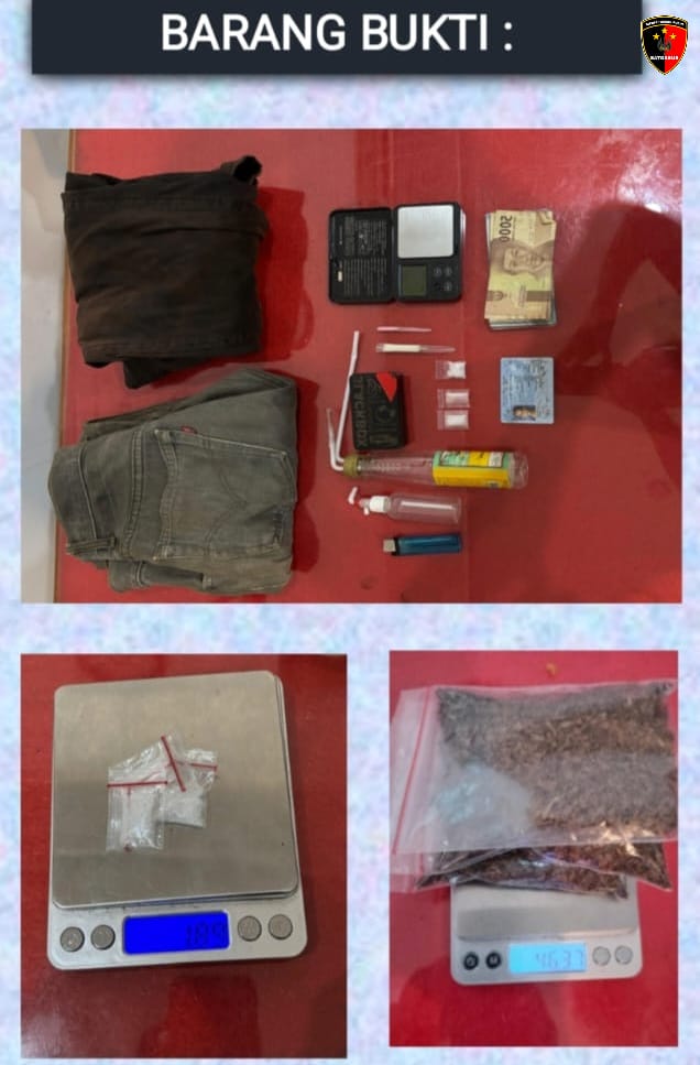 Terduga pelaku berinisial D (55) diamankan di rumahnya setelah petugas menerima informasi bahwa rumah pelaku sering dijadikan lokasi transaksi narkoba. Saat petugas mengamankan pelaku yang disaksikan perangkat warga setempat, petugas juga menyita dari tangan pelaku sejumlah barang bukti berupa 3 kantong klip transparan ukuran kecil berisi serbuk kristal diduga narkotika jenis sabu dengan berat 1,89 gram Brutto, 3 kantong plastik tembakau diduga ganja kering dengan berat 46,37 gram Brutto, 1 buah timbangan digital, 2 buah pipet modifikasi sendok sabu, 2 buah alat hisap sabu atau bong dan 1 buah korek api.