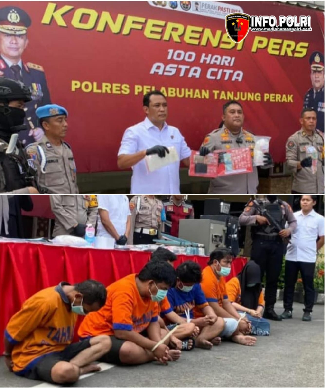 Polisi menunjukkan sejumlah barang bukti hasil pengungkapan kasus narkoba di Jalan Kunti, Surabaya.