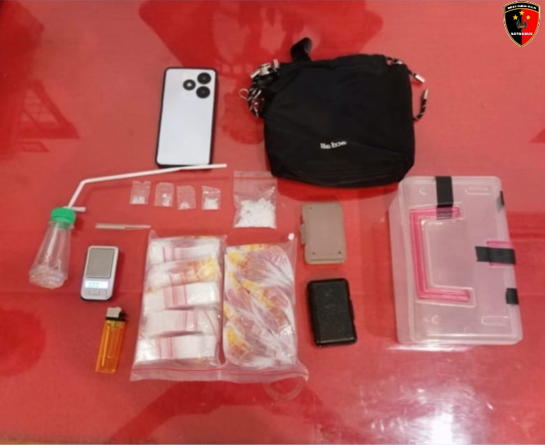 Pelaku diamankan di area rumahnya di Desa Bengaras Kecamatan Sungai Laur Kabupaten Ketapang. Saat petugas mengamankan pelaku yang disaksikan perangkat warga setempat, petugas mendapati dari tangan pelaku sejumlah barang bukti berupa 5 kantong klip plastik bening berisi kristal putih yang diduga narkotika jenis sabu dengan berat total 11,35 gram brutto, 1 alat hisap sabu berupa bong, 1 timbangan elektrik, 1 buah pipet, 1 buah korek api, 1 buah handphone serta uang tunai sejumlah 11.824.000 Rupiah.