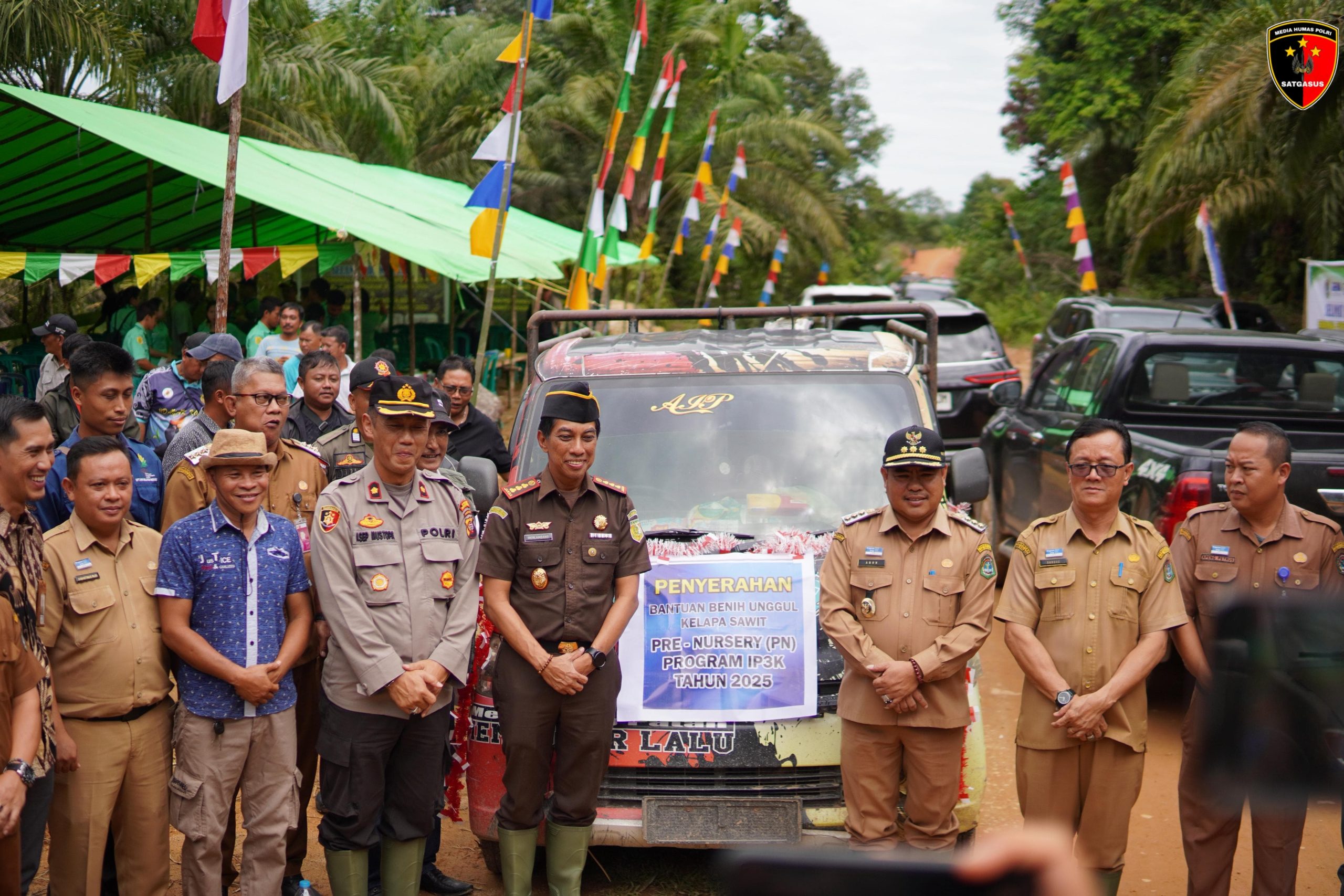 Wakapolres Sekadau Kompol Asep Mustopa Kamil menghadiri kegiatan Seremonial Penyerahan Bantuan Benih Unggul Kelapa Sawit Pre-Nursery (PN) dan Panen Perdana Program IP3K Tahun 2025 yang berlangsung di Gurung Mas, Kecamatan Nanga Mahap, Selasa (19/8).