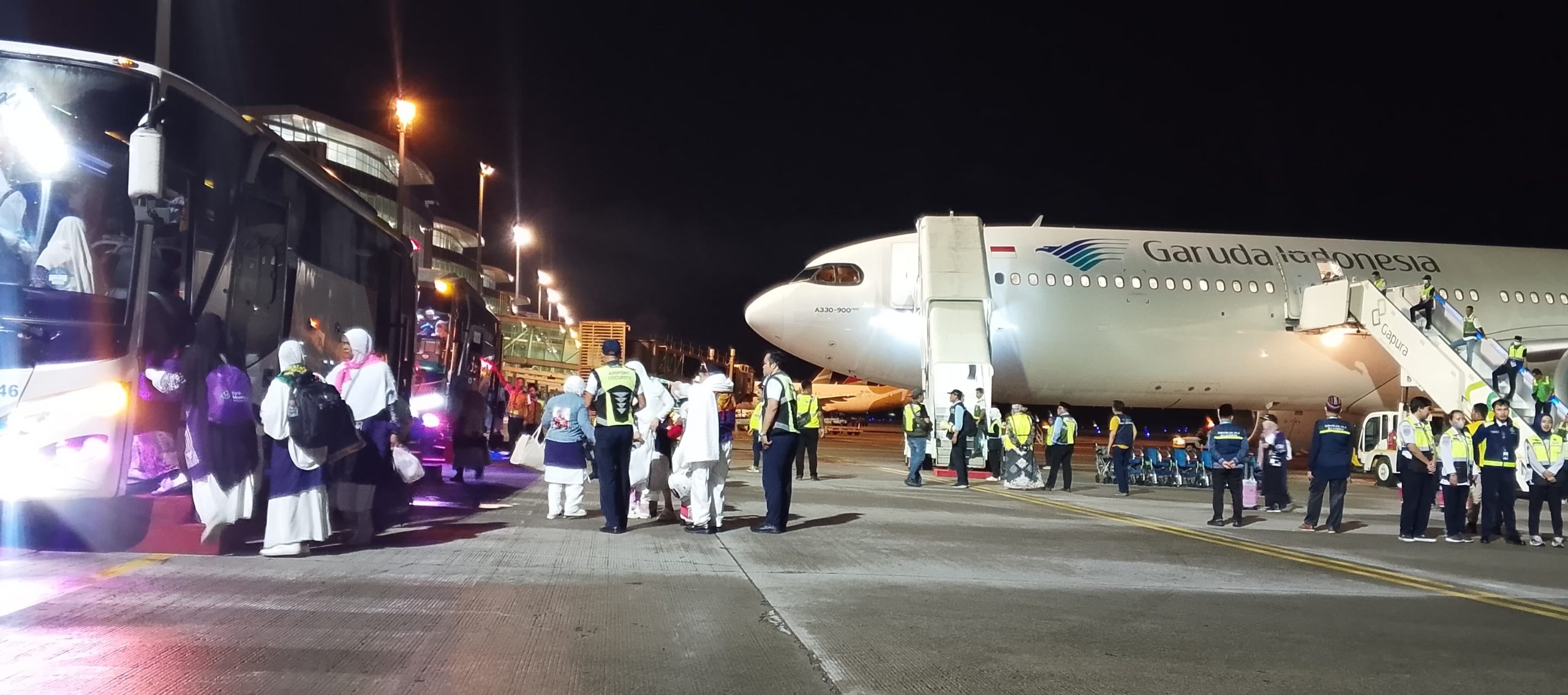 Tepat pada pukul 21.26 Wita, sebanyak 10 unit bus penjemput jamaah memasuki area airside bandara melalui Posko Perimeter (Main Gate) dan standby di area Fire Station lama.