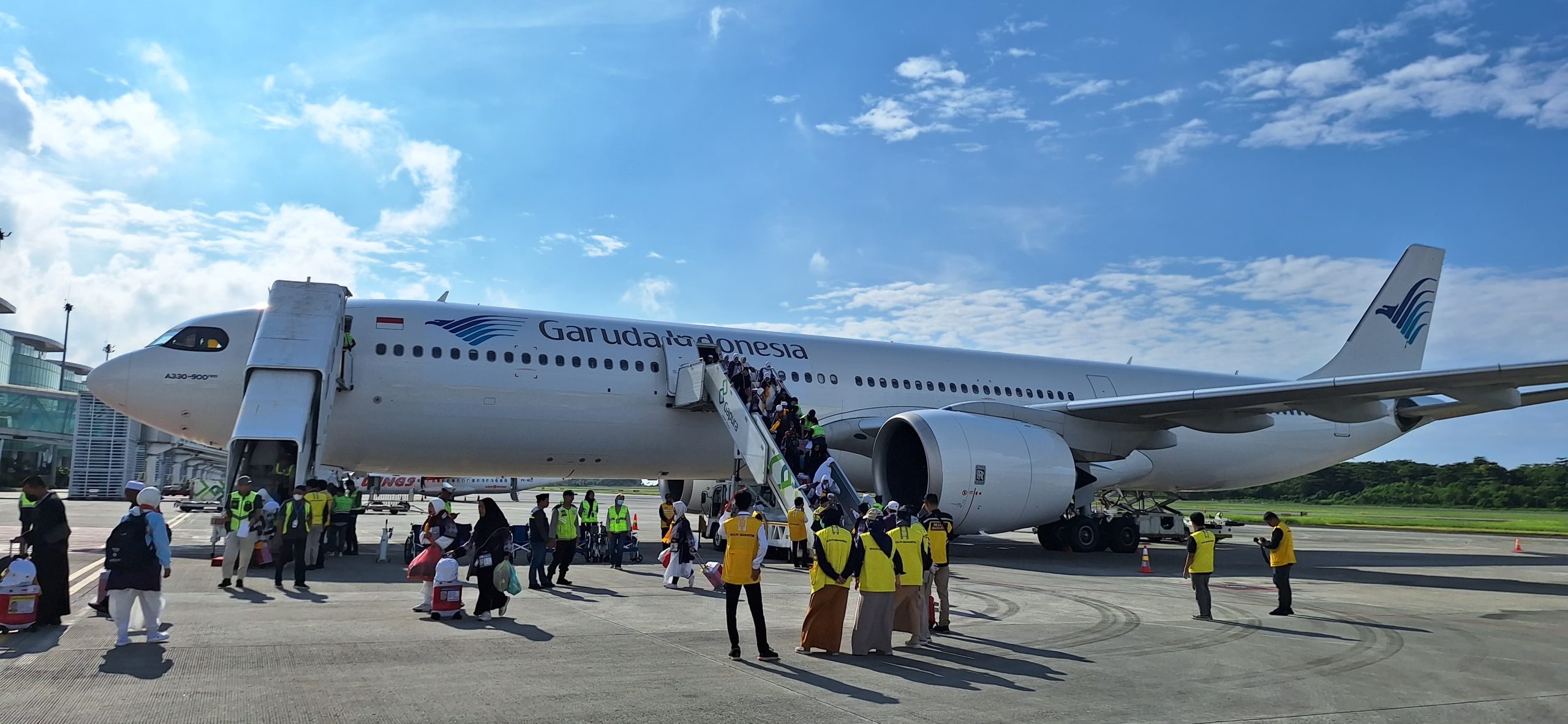 Pukul 08.43 s/d 09.40 WITA, jamaah turun dari pesawat dan langsung diarahkan menaiki bus.