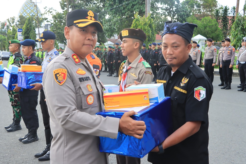 Sinergi TNI-Polri bersama pemerintah Kota Kotamobagu serta instansi terkait dalam rangka pengamanan malam penggantian tahun, Kapolres Kotamobagu pimpin apel gelar pasukan di lapangan Bokihotinimbang Kotamobagu, Selasa (31/12/2024).