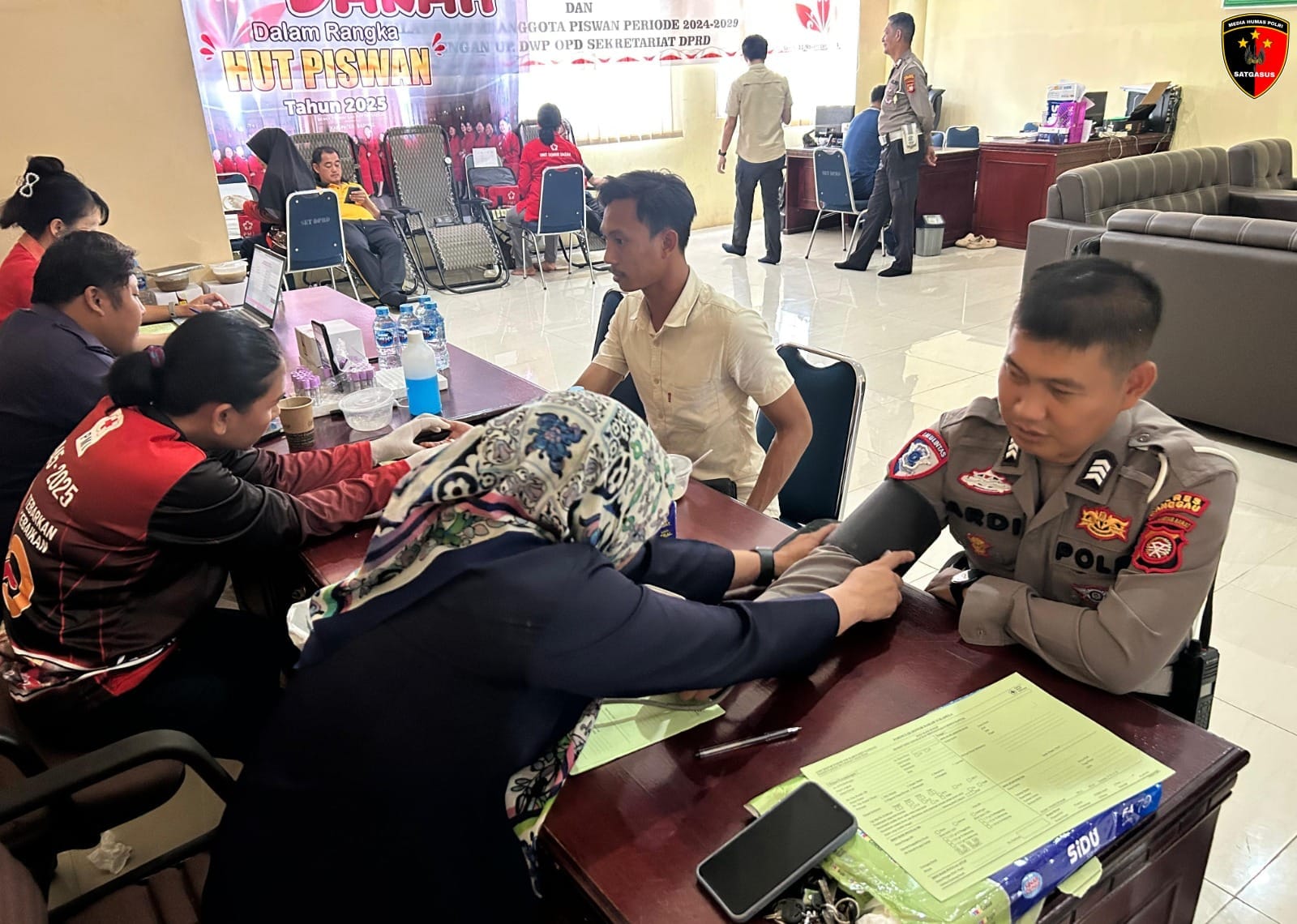 Sanggau, Polda Kalbar – Dalam semangat kebersamaan dan kepedulian sosial, personel Polres Sanggau turut berpartisipasi dalam kegiatan Donor Darah dan Cek Kesehatan Gratis yang digelar dalam rangka Hari Ulang Tahun Persatuan Istri Wakil Rakyat (PISWAN) Kabupaten Sanggau Tahun 2025. Kegiatan berlangsung pada Selasa (7/10/2025) pagi di Ruang Lantai I Sekretariat Bersama Kantor DPRD Kabupaten Sanggau, Jalan Jenderal Sudirman, Kelurahan Bunut, Kecamatan Kapuas.