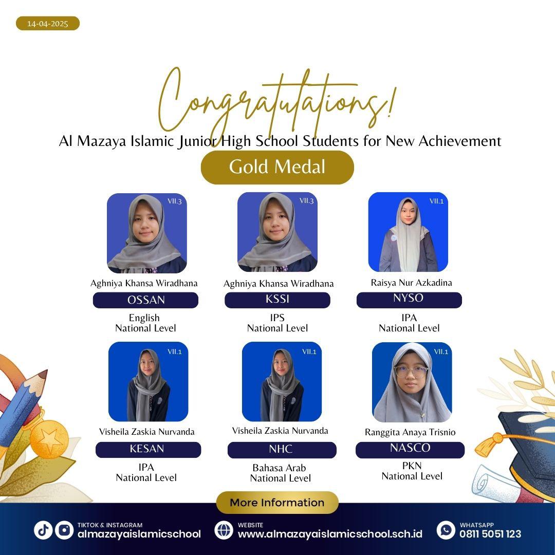 *Raisya Nur Azkadina* (Kelas 7) memboyong *satu medali emas* di NYSO IPA dan *dua medali perak* di NYSO Bahasa Indonesia.