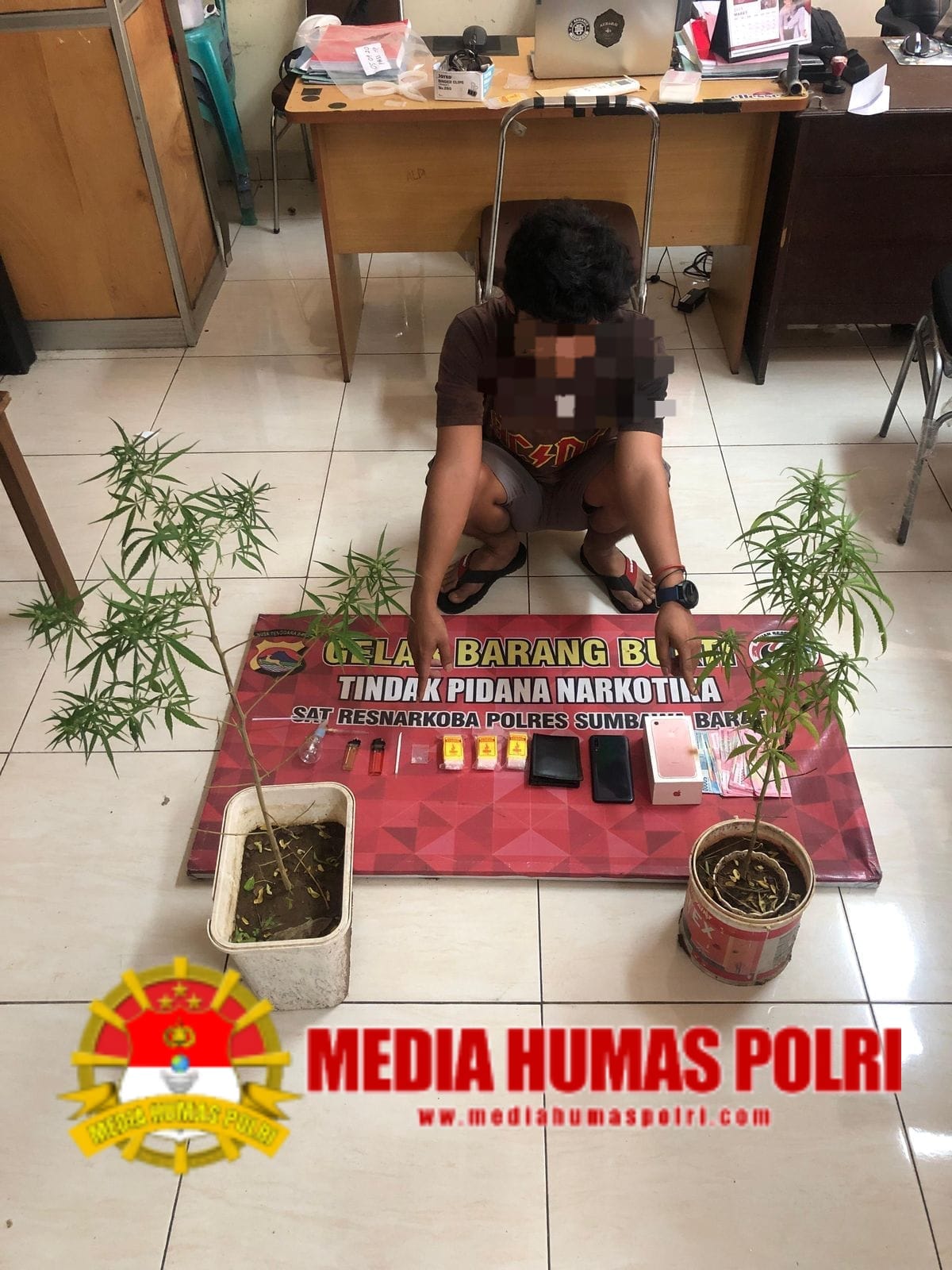 Tersangka ( YA ) ditangkap oleh Tim Opsnal Sat Resnarkoba bersama Barang bukti narkoba bentuk tanaman berupa 2 pot tanaman ganja yang tersangka simpan di belakang rumah tb empat tinggalnya, selain pohon ganja Tim Opsnal juga mengamankan barang bukti narkotika jenis sabu seberat 0,05 gr, uang tunai Rp.2.200.000,00 ( dua juta dua ratus ribu rupiah) serta Barang bukti lainnya, terang Kapolres Sumbawa Barat AKBP Yasmara Harahap, S.I.K melalui Kasi Humas AKP Zainal Abidin, S.H.