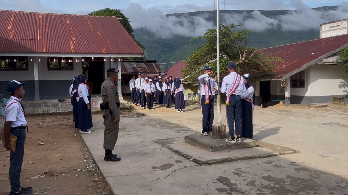 Satgas III Preventif Ops Madago Raya melalui Pos Kamtibmas Tamanjeka menggelar upacara bendera di SD SMP SATAP Uweralulu, Kecamatan Poso Pesisir, Kabupaten Poso, pada Senin (24/2/2025). Upacara ini dipimpin langsung oleh Danpos Tamanjeka, Bripka Ismianto.