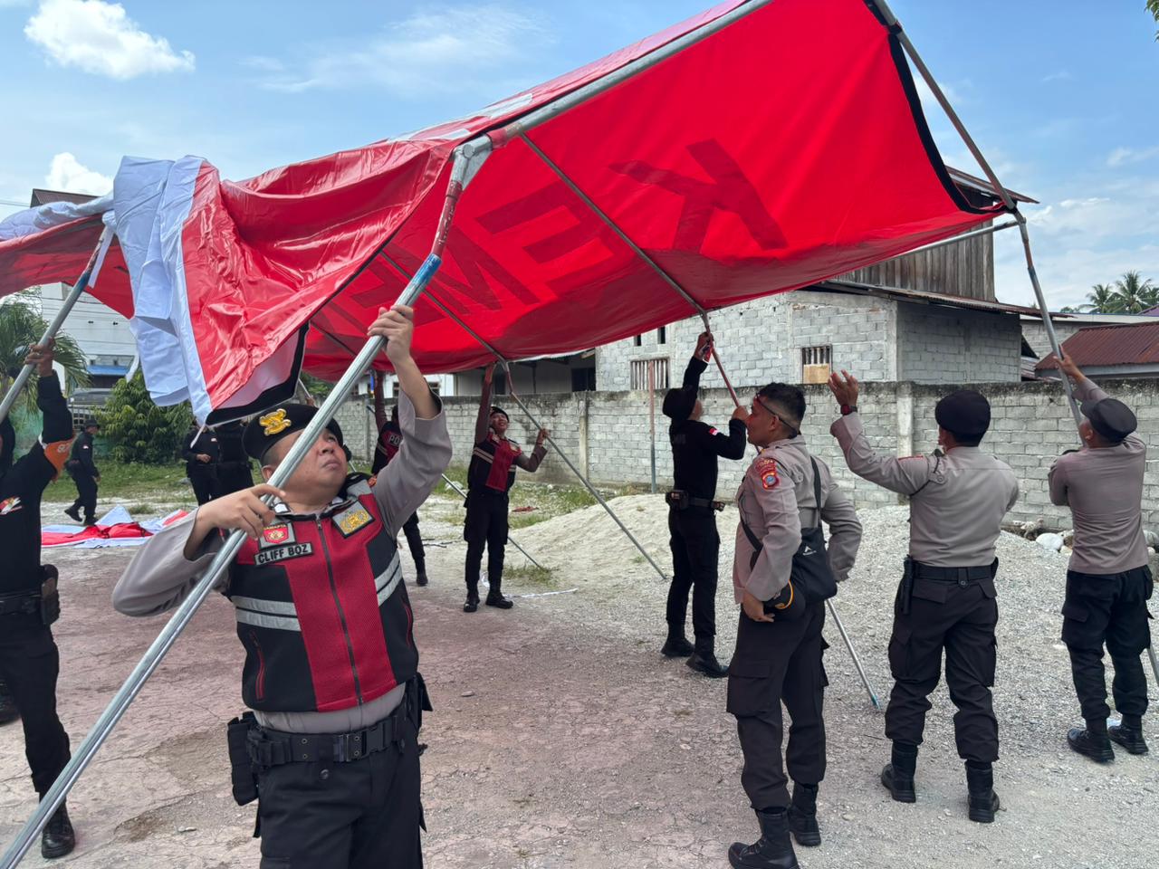Pemasangan tenda dilakukan oleh personel gabungan yang dipimpin langsung oleh Kabag Ops Polres Poso, AKP Sudji Hartono, SH, didampingi Kasat Sabhara Iptu Trimulyoko, SH. Tenda ini disiapkan sebagai tempat perlindungan sementara bagi warga terdampak, khususnya para siswa dan keluarga mereka yang rumahnya mengalami kerusakan akibat gempa.