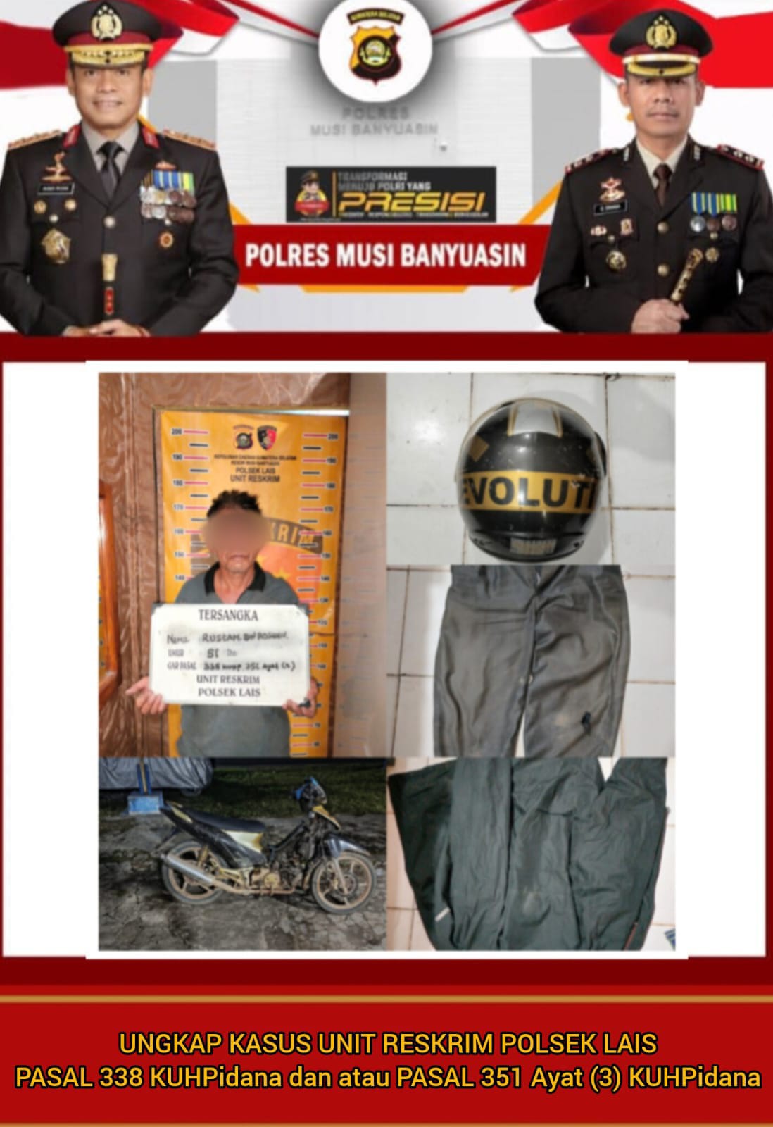Tim Gabungan Sat Reskrim Polres Musi banyuasin Unit Reskrim Polsek Lais dan Unit Reskrim Polsek Bayung Lincir menangkap pelaku pembunuhan terhadap RUSWAN berusia 64 yang terjadi di Jalan Umum Simpang KUD Dusun II Desa Teluk Kijing III Kecamatan Lais Kabupaten Muba pada Sabtu 22 November 2025 Sore hari.