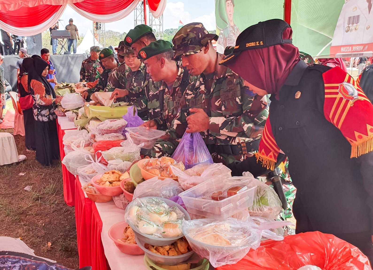 Suasana kebersamaan menyelimuti lapangan Desa Soko Kecamatan Temayang Kabupaten Bojonegoro Jawa Timur, saat masyarakat setempat berbondong-bondong membawa puluhan nasi tumpeng untuk di makan bersama ratusan personel Satuan Tugas (Satgas) TNI Manunggal Membangun Desa atau TMMD ke- 125 Kodim 0813 Bojonegoro, Kamis (21/8/2025).