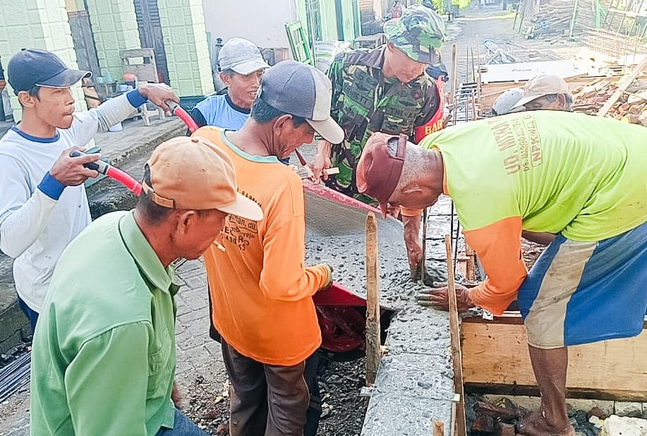 Jajaran TNI dari Koramil 09/Sumberrejo Kodim 0813 Bojonegoro, bersama masyarakat melaksanakan karya bakti pengecoran pondasi Musholla Baitul Mukminin Dusun Nglandean RT.010/RW.002 Desa Margoagung Kecamatan Sumberrejo Kabupaten Bojonegoro Jawa Timur, Jum’at (9/5/2025).