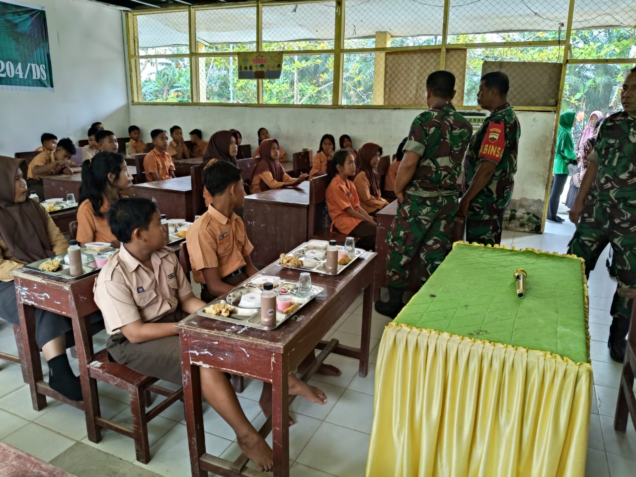Kegiatan makan siang gratis ini merupakan hasil kerjasama TNI, POLRI, dan Pemerintah daerah, sebagai bagian dari program pemerintah untuk meningkatkan gizi anak – anak sekolah di Indonesia. (Mul)