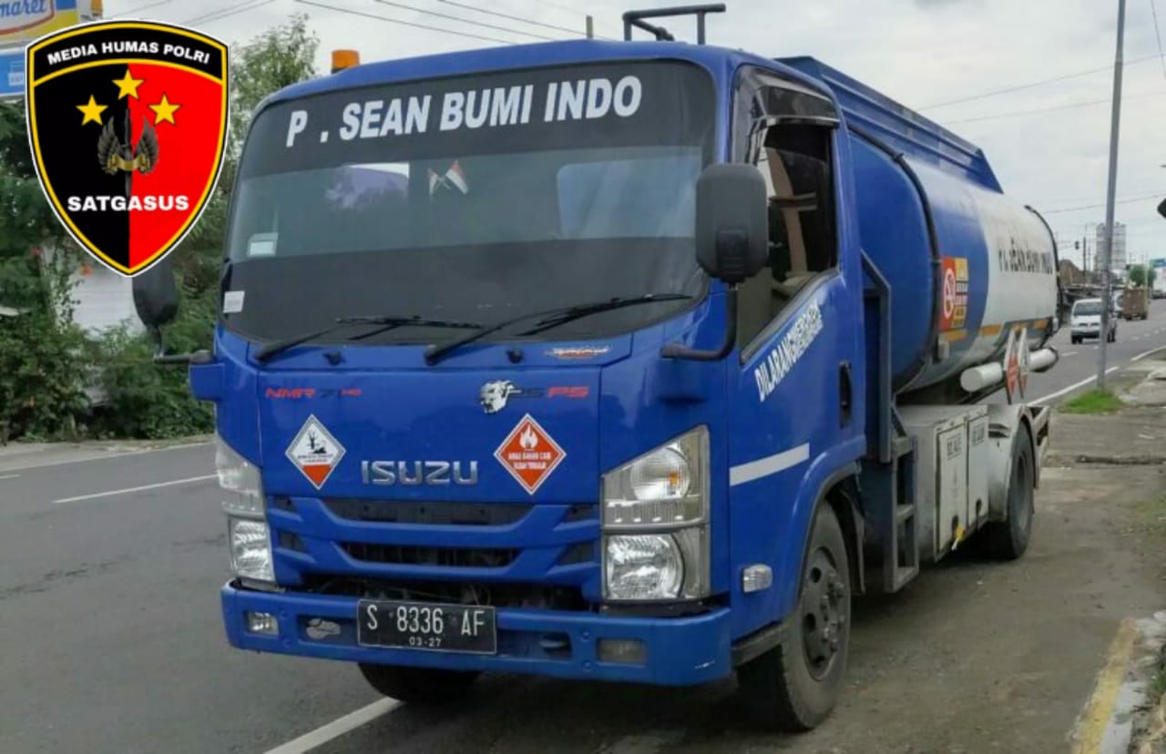 Sebuah unit mobil tangki berwarna biru putih dengan logo PT Sean Bumi Indo dan nomor polisi S 8336 AF diamankan anggota Polsek Bandar Kedungmulyo, Kabupaten Jombang, Senin (9/12/2024). Penahanan mobil tersebut bermula dari laporan lima jurnalis yang mencurigai adanya dugaan pelanggaran distribusi bahan bakar minyak (BBM) bersubsidi.