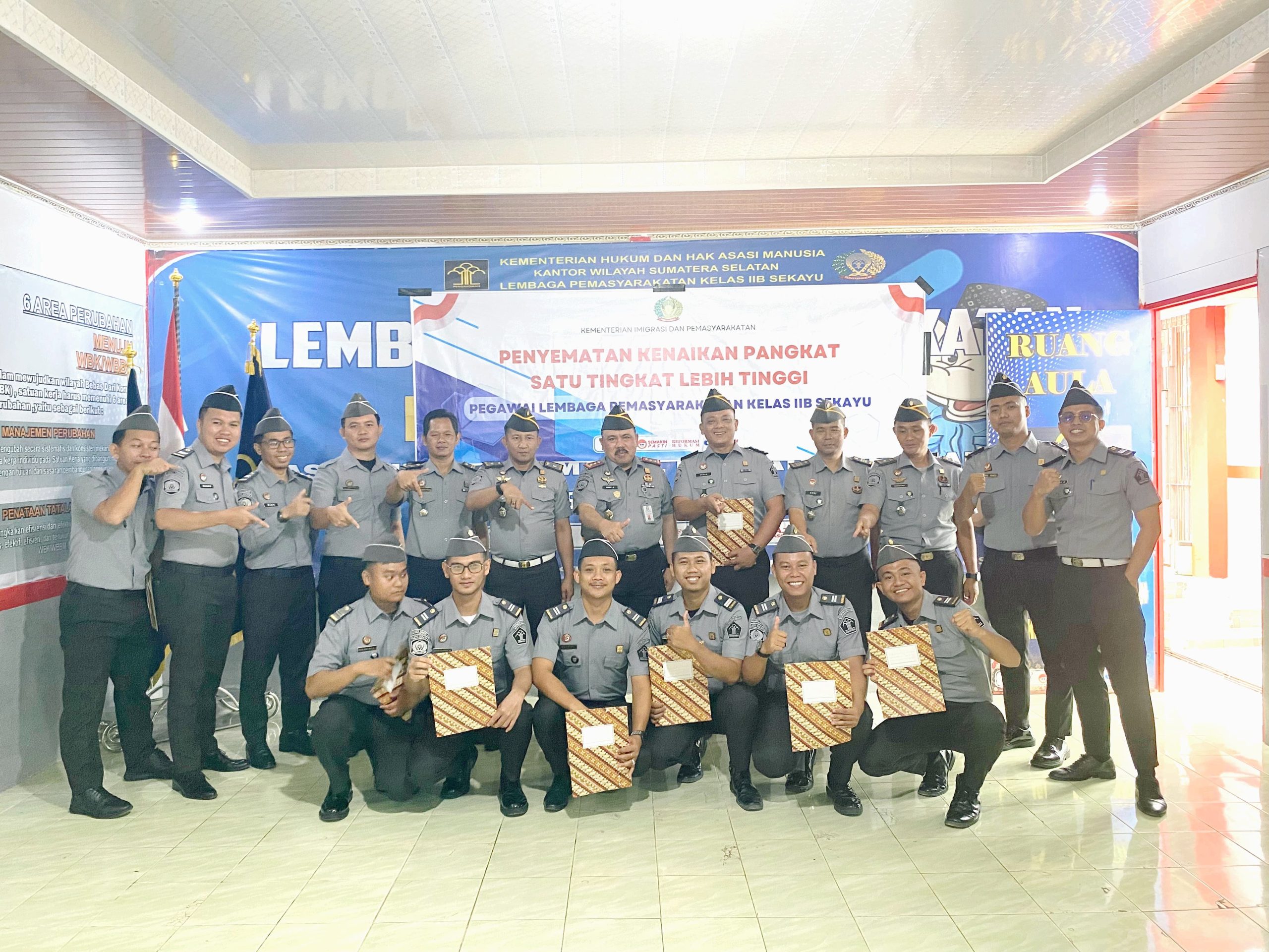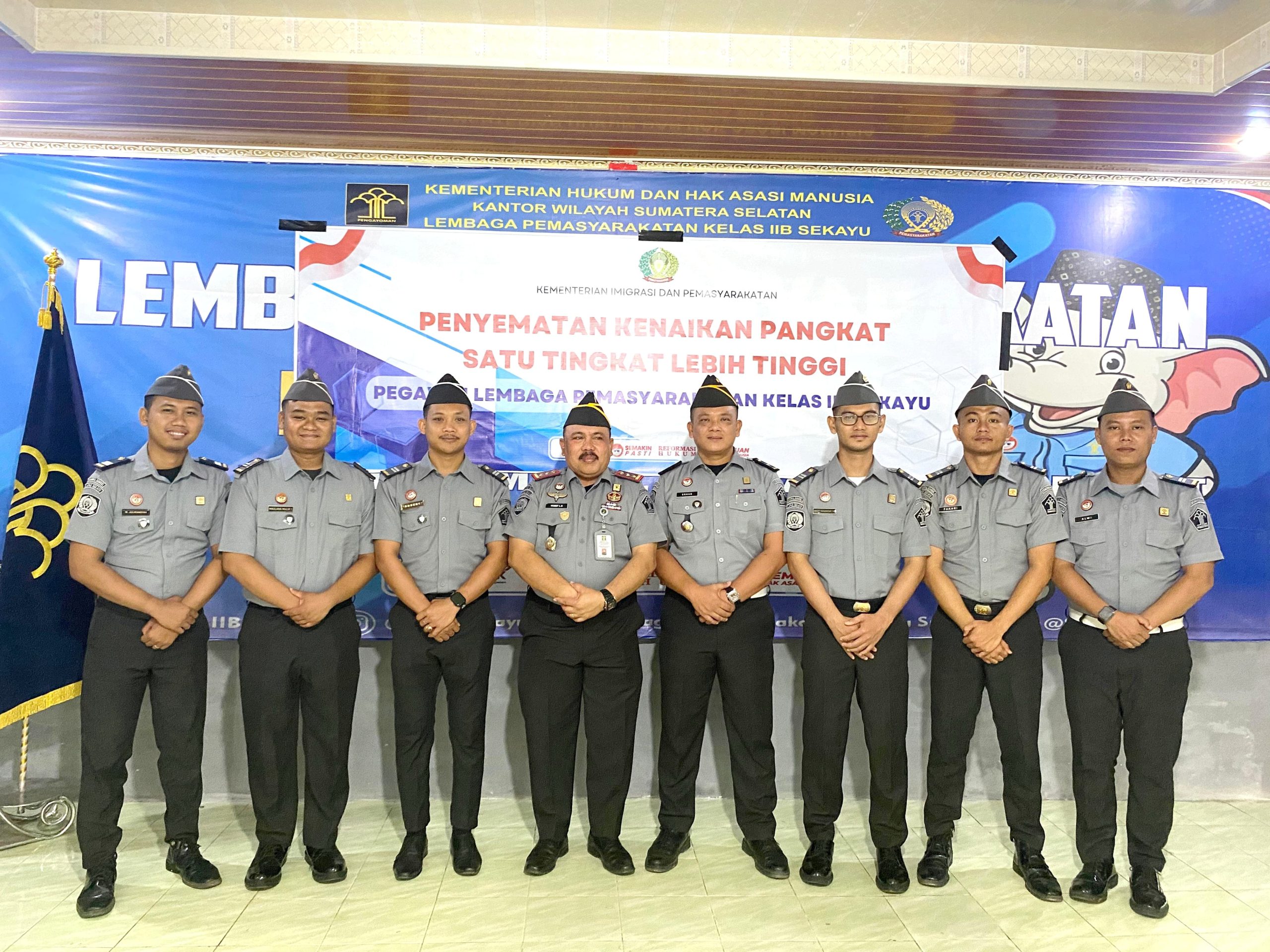 Sebanyak tujuh orang Pegawai Lapas Kelas IIB Sekayu dinyatakan berhak atas kenaikan pangkat setingkat lebih tinggi, yang ditandai dengan Apel Penyematan Tanda Kenaikan Pangkat di Aula Lapas Sekayu, Selasa (3/12/2024).