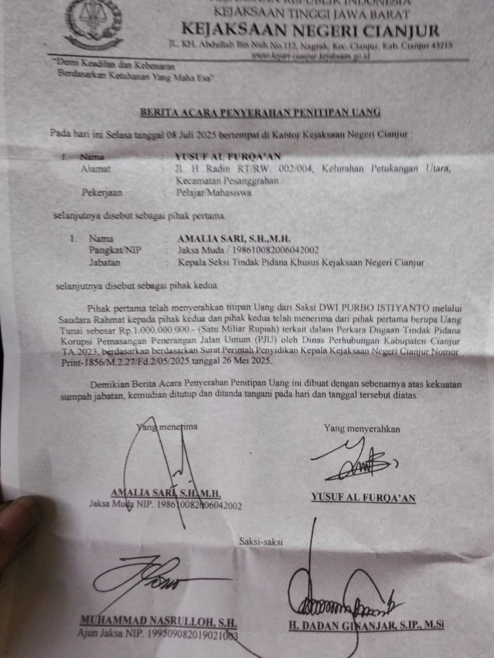 Disebutkan bahwa uang sebesar Rp 1 miliar diserahkan oleh Yusuf Al Furqa’an atas nama Dwi Purbo kepada jaksa, dan telah diterima serta dicatat sebagai bagian dari proses penyidikan.