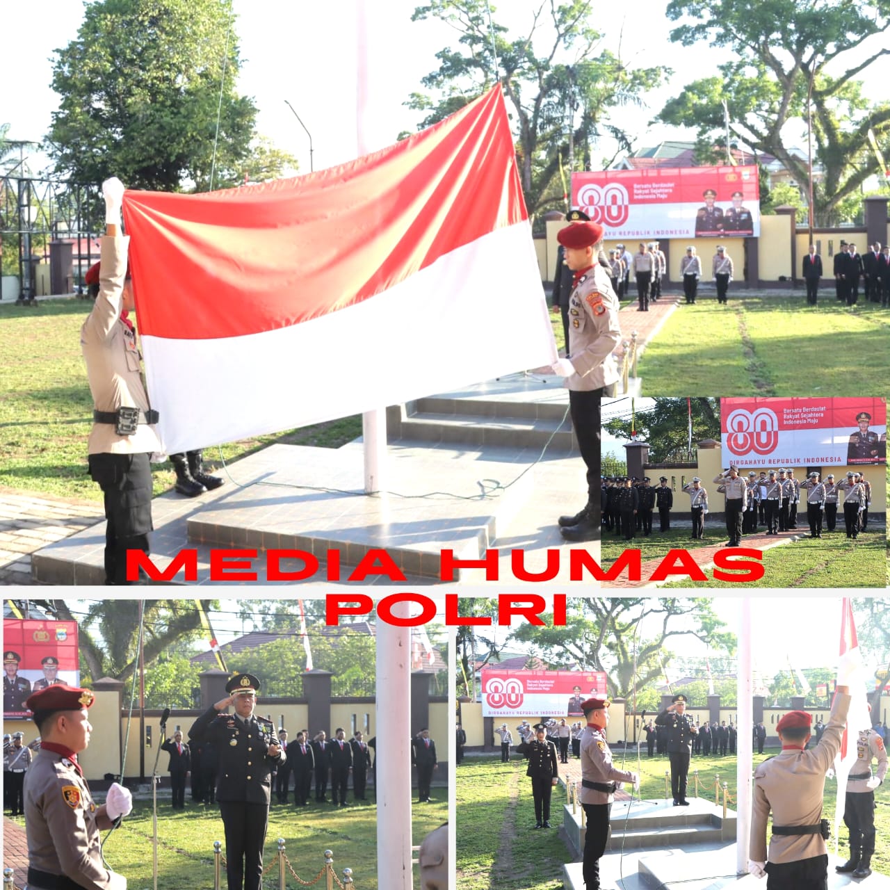 Kapolres Kotamobagu AKBP Irwanto, SIK, MH bertindak selaku Inspektur Upacara hari kemerdekaan Republik Indonesia ke-80 di halaman upacara Mapolres Kotamobagu, Minggu (17/8/2025).