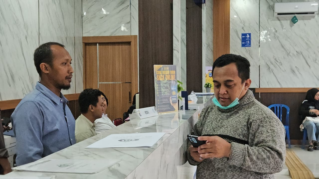 Layanan diberikan secara daring dan luring oleh petugas pelayanan. Mereka mendapat nomor antrean sesuai pemberkasan yang masuk dan tercatat di meja pelayanan.