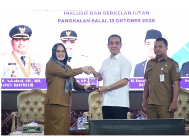 Wakil Bupati Banyuasin Netta Indian, S.P buka Workshop Evaluasi Pengelolaan Keuangan Dan Pembangunan Desa Di Kabupaten Banyuasin dengan tema Pengelolaan Keuangan Desa Yang Akuntabel Dalam Rangka Akselerasi Pertumbuhan Ekonomi Yang Inklusif Dan Berkelanjutan bersama anggota komisi XI DPR RI H. Fauzi Amro, S.Pt., M.Si. Senin (13/10)