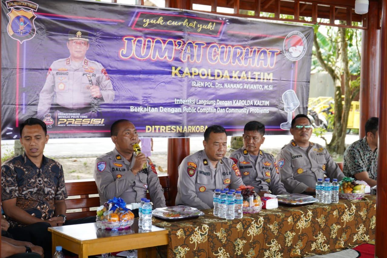 Dalam sambutannya, perwakilan Ditresnarkoba IPDA Ardyansa, S.H., menyampaikan bahwa kegiatan Jumat Curhat ini merupakan bagian dari komitmen Polri dalam mendengar langsung keluhan masyarakat, mempererat kemitraan, serta meningkatkan efektivitas pelayanan dalam menjaga keamanan dan ketertiban di wilayah Kalimantan Timur.