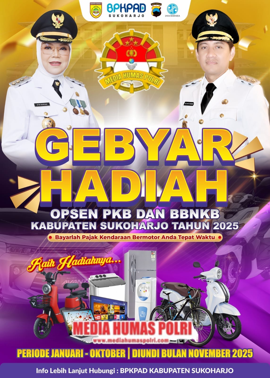 Siaran pers dari humas Jasa Raharja Sukoharjo, Kamis, 25 September 2025, sebagai bentuk apresiasi dan penghargaan kepada para wajib pajak yang taat, Pemkab Sukoharjo juga melaksanakan Program Gebyar Hadiah Opsen PKB & BBNKB 2025. Hadiah menarik menanti wajib pajak dial antaranya sepeda motor,alat barang elektronik dan berbagai hadiah menarik lainnya.