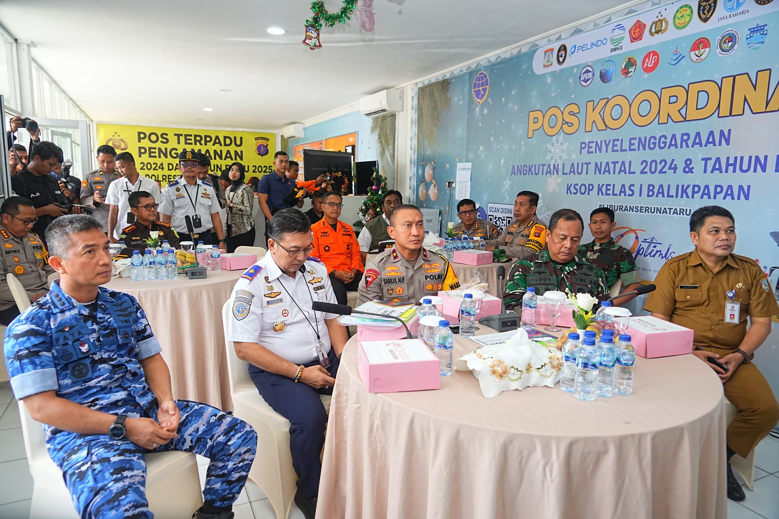 Wakil Kepala Kepolisian Daerah Kalimantan Timur Brigjen Pol Dr. H. M. Sabilul Alif, S.H. S.I.K., M.Si., didampingi sejumlah Pejabat Utama Polda Kaltim mengikuti pemantauan secara virtual melalui Zoom Meeting terkait persiapan perayaan Natal dan Tahun Baru (Nataru) 2024 yang dipimpin langsung Menteri Koordinator Bidang Pembangunan Manusia dan Kebudayaan (Menko PMK), Prof. Dr. Pratikno, M.Soc.Sc., yang bertempat di Pelabuhan Semayang Balikpapan, Selasa (24/12/24).