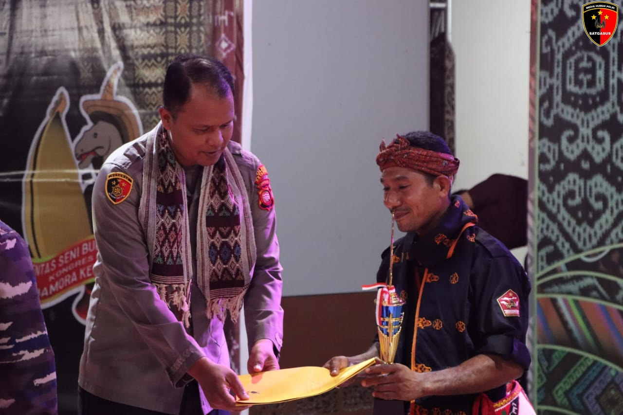 Kapolres Ketapang AKBP Muhammad Harris S.H., S.I.K., M.I.K., CPHR yang diwakili oleh Wakapolres Ketapang Kompol Frits Orlando Siagian S.I.K., M.H. bersama jajaran Forkopimda Kabupaten Ketapang menghadiri kegiatan Penutupan Pentas Seni Budaya Flobamora III sekaligus Kongres Ke-2 Tahun 2025 yang berlangsung di Balai Sungai Kedang, Pendopo Bupati Ketapang, pada Sabtu (15/11/2025) .