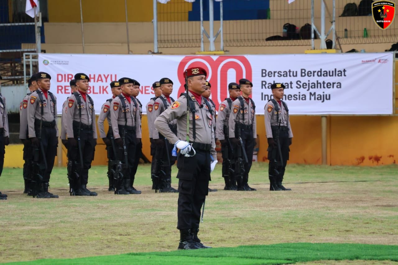 Wakapolresta Pontianak menghadiri upacara penurunan bendera merah putih dalam rangka peringatan HUT ke-80 Republik Indonesia yang berlangsung di Lapangan sepak bola Kebon Sajoek PSP Pontianak, Minggu sore (17/8/2025) sore.
