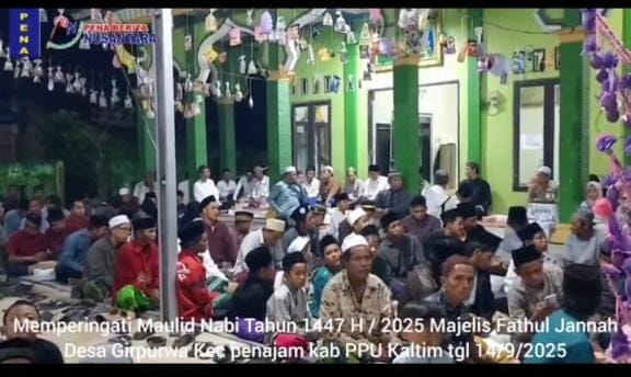 Ribuan jamaah menghadiri perayaan Maulid Nabi Muhammad SAW yang digelar di halaman Masjid Miftahul Jana’ah, Kilometer 05, Desa Giripurwa, Kecamatan Penajam, Minggu malam (14/9/2025). Acara ini menjadi tradisi tahunan masyarakat setempat yang selalu berlangsung meriah dan penuh khidmat.
