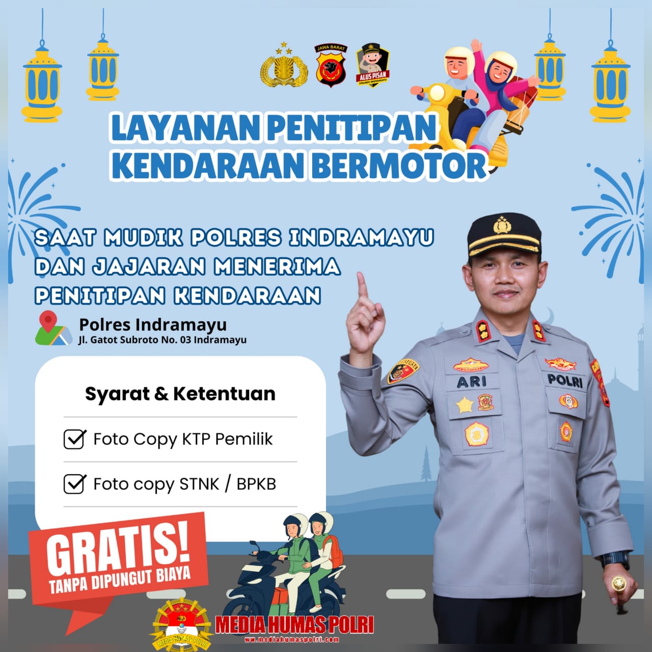 mengatakan, masyarakat yang hendak melakukan mudik lebaran bisa menitipkan kendaraan mereka di seluruh kantor polisi yang ada di Indramayu. Layanan ini gratis, tanpa dipungut biaya.