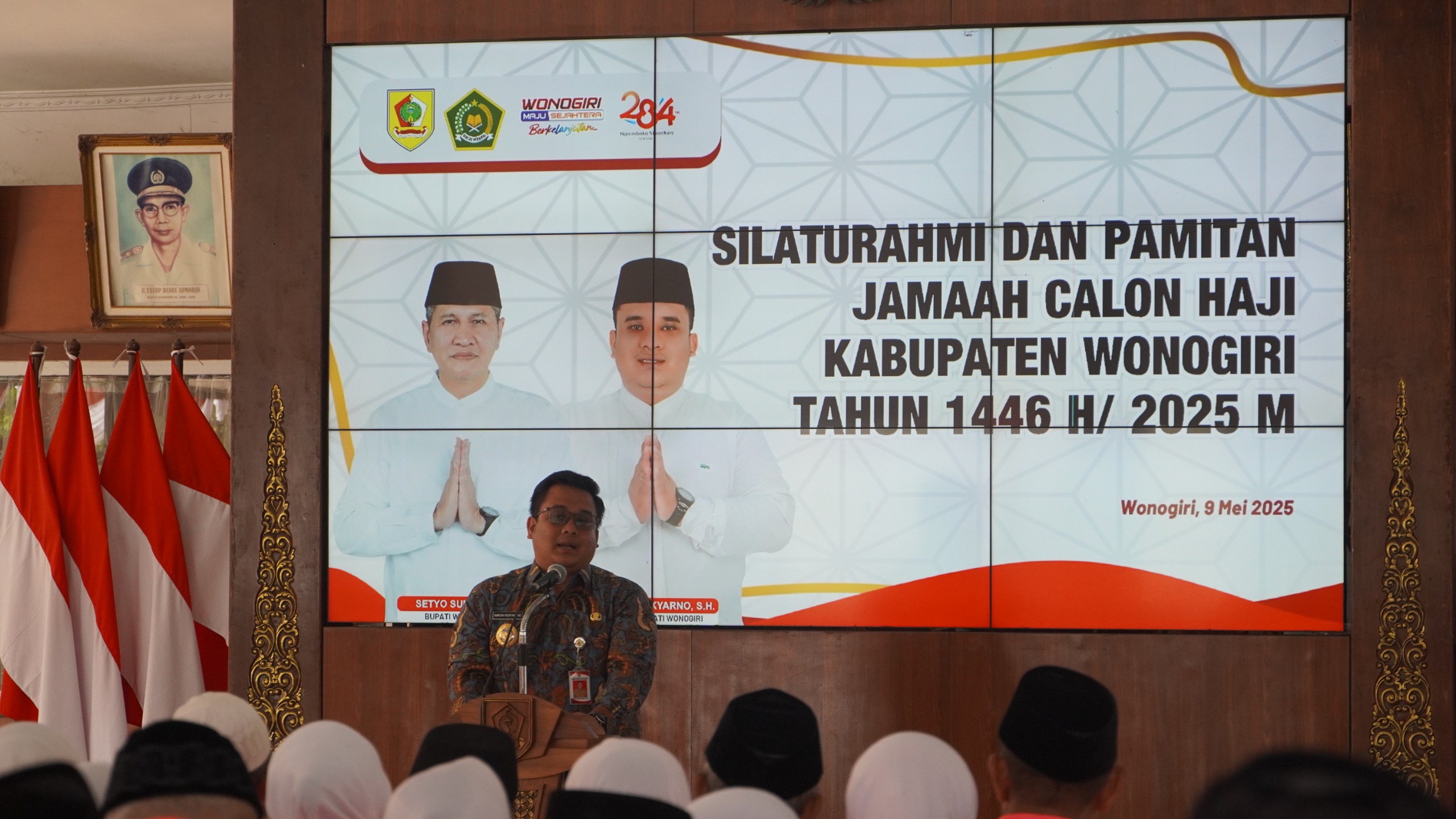 Suasana haru mewarnai Silaturahmi dan Pamitan Jamaah Calon Haji Kabupaten Wonogiri Tahun 1446 H / 2025 M yang digelar di Pendopo Rumah Dinas Bupati Wonogiri, Jumat pagi (9/5/2025).