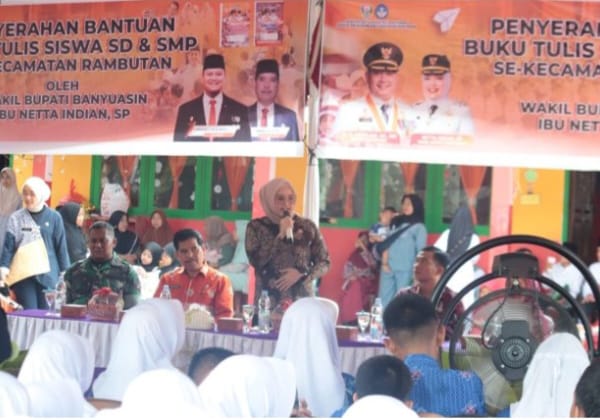 Wakil Bupati Banyuasin, Netta Indian, SP didampingi oleh Kepala Dinas Pendidikan dan Kebudayaan Banyuasin, Aminudin, S.Pd., S.IP., M.Si memberikan bantuan buku tulis untuk Sekolah Dasar (SD) dan Sekolah Menengah Pertama (SMP) Se-Kecamatan Rambutan di SD Negeri 5 Rambutan, Kabupaten Banyuasin, Kamis (16/10/2025)