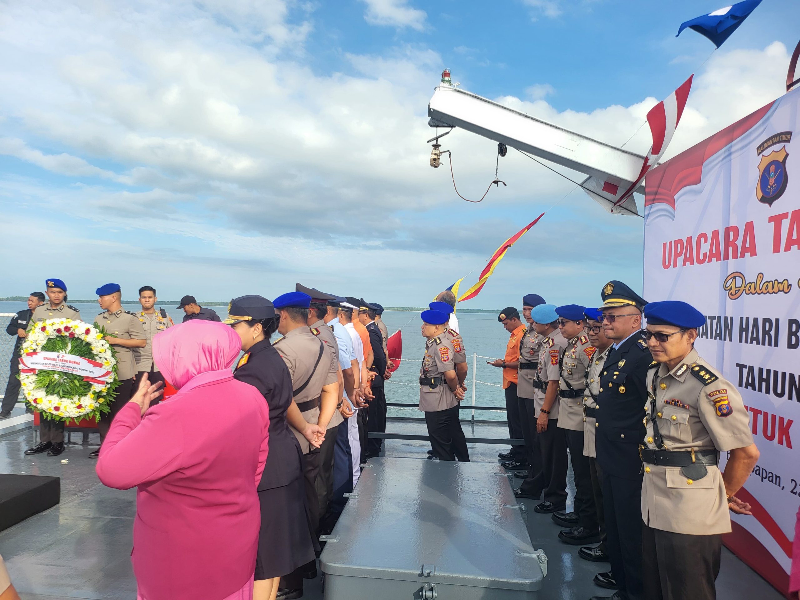 Dalam rangka memperingati Hari Ulang Tahun (HUT) Bhayangkara ke-79, Kepolisian Daerah Kalimantan Timur (Polda Kaltim) bersama Kepolisian Resor Kota (Polresta) Balikpapan menggelar kegiatan ziarah dan tabur bunga di Taman Makam Pahlawan (TMP) Darma Agung dan Perairan Semayang, Balikpapan, pada Senin (23/6).