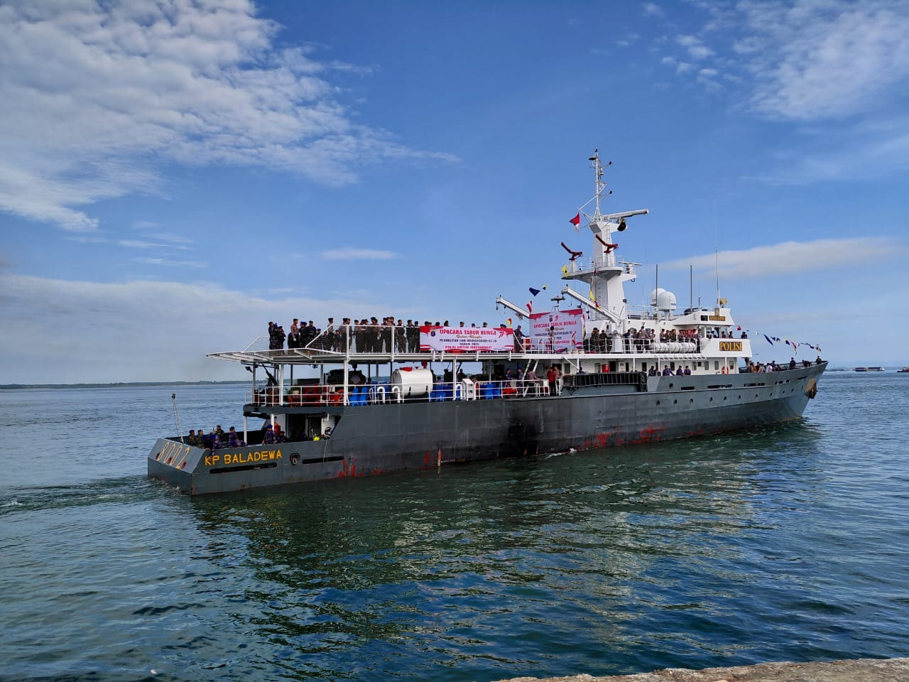 Tabur bunga di laut menggunakan kapal milik TNI AL di Pelabuhan Semayang, Balikpapan.